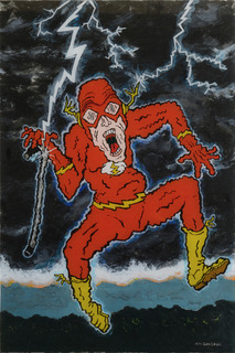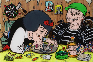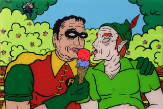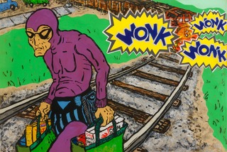 Ferdevarius is an amalgain of an iron and a violin, while Clock features a working timepiece and a manic‑seeming red ''cuckoo.'' The best of these works display a broad humour and a playful sense of kitsch and culture.